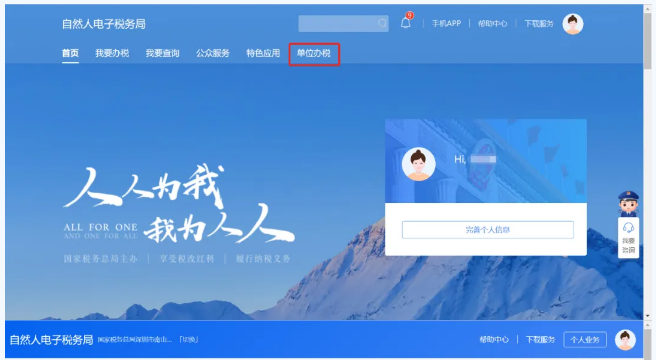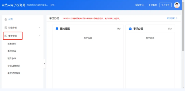 2.登錄後,點擊【單位辦稅】,選擇要(yà ♦ o)辦理(lǐ)集中申報(bào)的(de)$φ≥企業(yè),點擊左側【集中申報(bào)】進入集中申報(bào)≤ 業(yè)務辦理(lǐ)頁面。