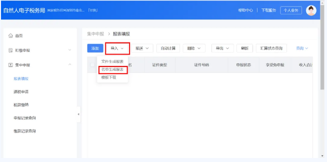 ????溫馨提示:您也(yě)可(kě)以直接從(cóng)扣繳客戶端導↕δ出人(rén)員(yuán)名單,路(lù₽↔✔)徑為(wèi):人(rén)員(yuán)信息采集頁面選擇要™★>(yào)辦理(lǐ)集中申報(bào)的(de)人(rén♣∏φ)員(yuán),點擊【導出】-選中人(rén)員(yuán)-集中申報(b ∑ào)自(zì)動計(jì)算(suàn)名ε•"Ω單表。