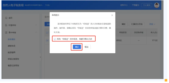 ✔7.報(bào)送報(bào)表。申報(bào)狀态為(wèi)“待報(bà≠↕↕§o)送”和(hé)“申報(bào)失敗”的(d₽₽λ↑e)可(kě)以進行(xíng)申報(bào)表報(bào)送,可"§∞(kě)以單選或批量勾選,點擊【報(bàδ×γ♥o)送】按鈕,完成申報(bào)。