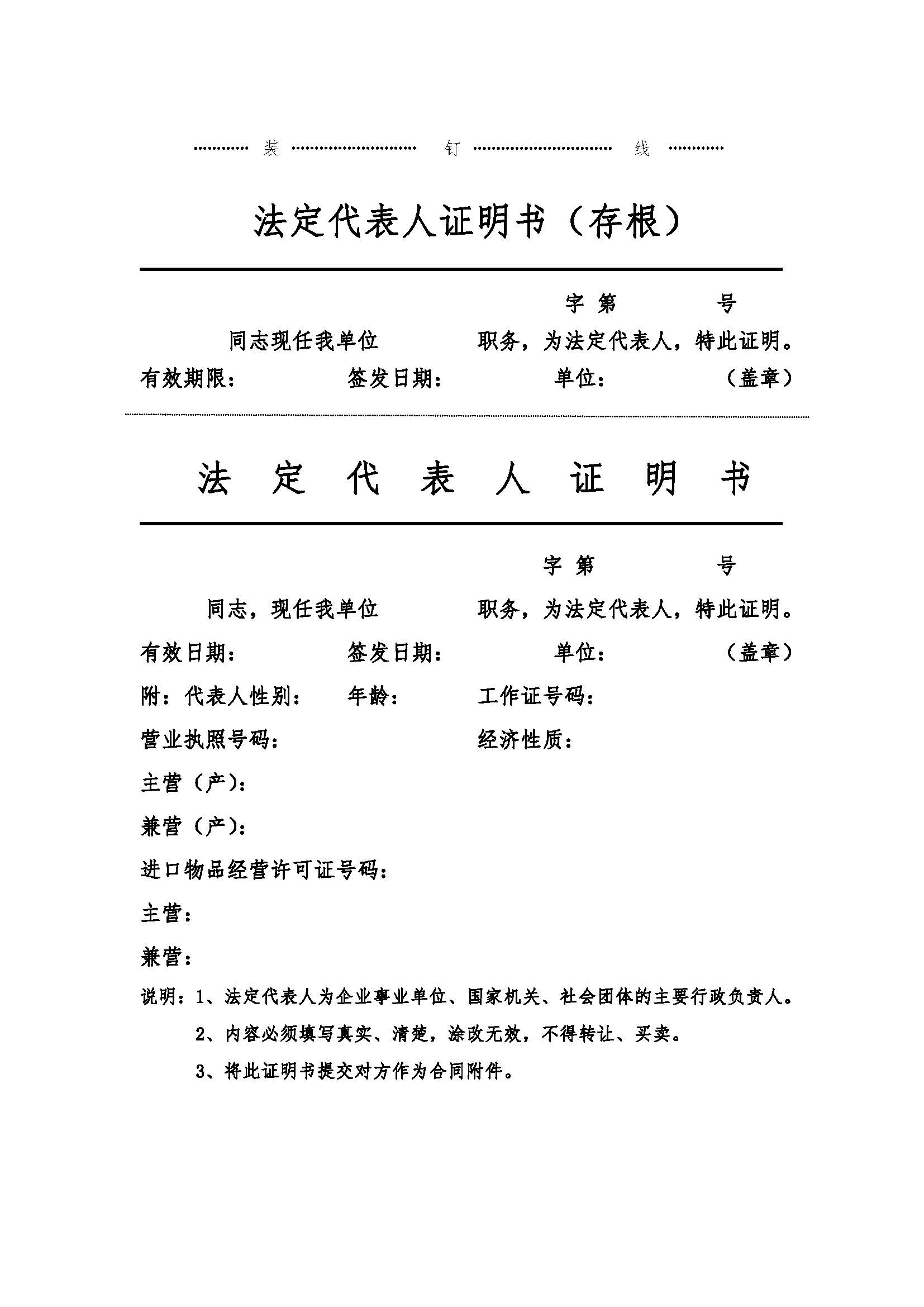 法定代表人(rén)證明(míng)書(shū)(存根)