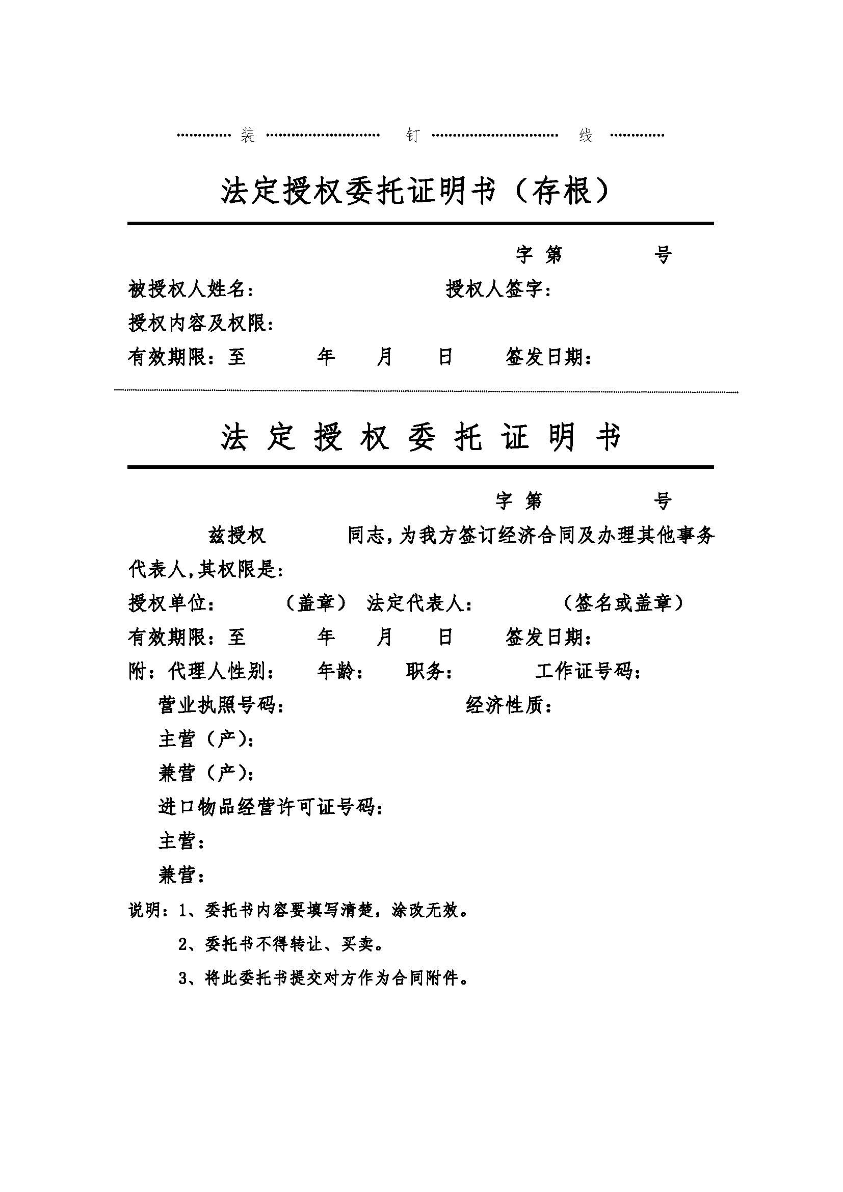 法定授權委托證明(míng)書(shū)(存根)