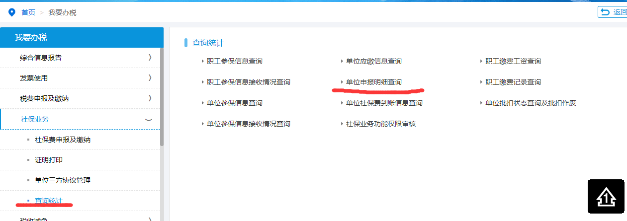 第三步:在網頁的(de)左邊點”查詢統計(jìφβ&∑)“——點頁面中間(jiān)”單位申報(bào)明(míng♥↓)細查詢“
