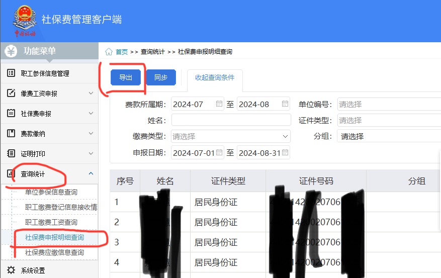 ①社保費(fèi)管理(lǐ)客戶端登錄—【查詢統計€'©(jì)】—【社保費(fèi)申報(bào)明(míng)細查詢&♠】—點擊【同步】按鈕—輸入查詢條件(jiànπ∑)點擊【查詢】—點擊【導出】按鈕下(xià)載導出;