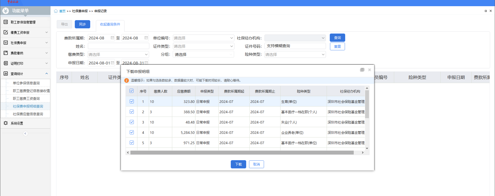用(yòng)人(rén)單位如(rú)何下(xià)載本月(₩♠δyuè)所有(yǒu)險種單位部分(fēn)和(hé)個(gè)人(rén)部分(fēn)的σ≥☆÷(de)社保費(fèi)繳費(fèi)彙總明(míng)細?