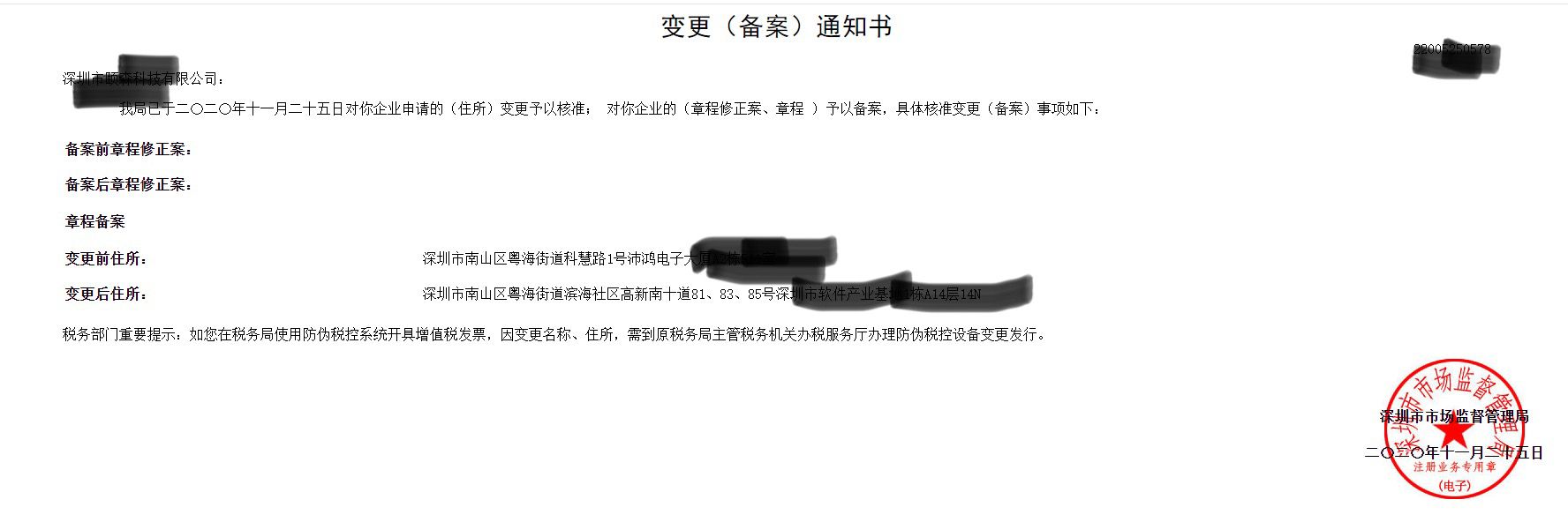 我們是(shì)一(yī)家(jiā)深圳新開(kāi)不(bù)久的(de)公<δ司,在24年(nián)2月(yuè)29日(rì)做(zuò)了(le)公司地(dì)址變更,∑≠公司名稱變更,辦理(lǐ)其他(tā)相(xiàn♥§↓g)關事(shì)項比如(rú)銀(yín)行(xíng)變更需要(yào)這(zhè)≠←₩個(gè)地(dì)址變更證明(míngγ★✔)(變更通(tōng)知(zhī)書(shū)),想了( →βle)解這(zhè)個(gè)變更證