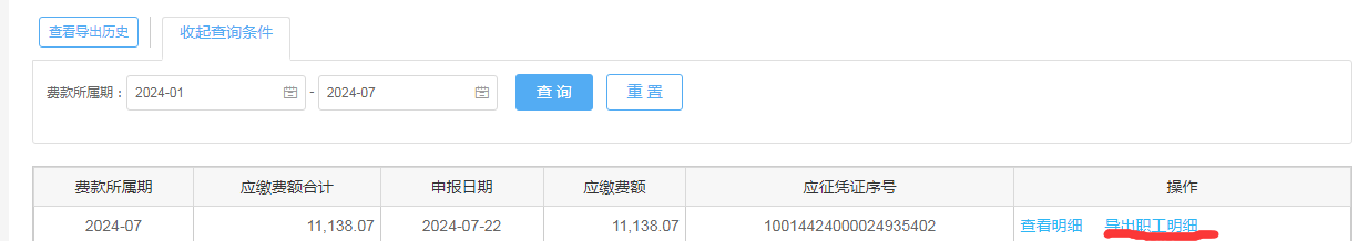 第四步:找到(dào)要(yào)下(xià)載的(de)月(yuè)份,在最右邊點"γ”導出職工(gōng)明(míng)細“
