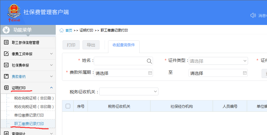 第三步【證明(míng)打印】—【職工(g≥ ōng)繳費(fèi)證明(míng)開(kāi)具】;